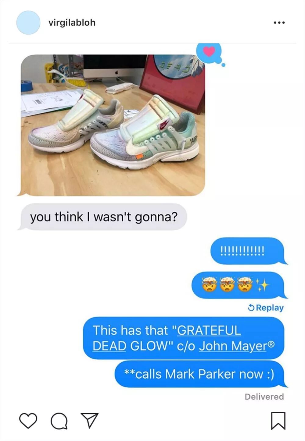 如果大家有一直关注《墙外世界》的话,那你一定还记得昨日我们报道的 “蓝染” Virgil Abloh x NikeLab Air Presto 吧。但今天,这波 DIY 热潮出现了更新,那就是 John Mayer 晒出的新染色版本,他还将照片发给了 Virgil ,对此,Virgil 给出了非常认可的回应,并且表示,要打电话给 Nike 总裁 Mark Parker 了…… 其实早在两天前,Off-White™ 就在 Instagram 上呼吁大家可以动手去 DIY 纯白的 Virgil Abloh x NikeLab Air Presto ,并且主动发起了一个 Hashtag —— #readymadeoffwhite ,所以后天你如果能幸运买到鞋子的话,那可别错过了这波热潮啦。