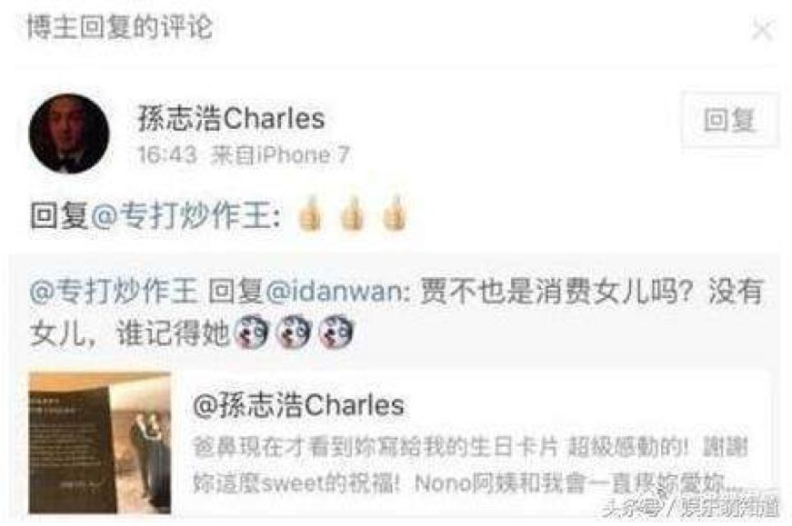 贾静雯的前夫孙志浩,隔段时间就要微博喊话,点赞、转发网友骂贾静雯的内容,含沙射影的造谣贾静雯;
