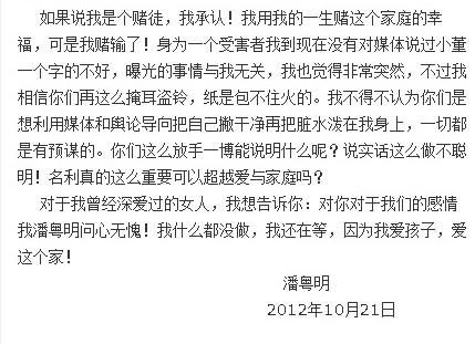 潘粤明和前妻董洁本来是金童玉女一样的存在,婚姻美满让人羡慕,但后来感情还是破裂了,董洁工作室发声明说离婚的责任都在男方,并指责潘粤明“脾气暴躁、烂赌欠债”,且暗示他婚内出轨。