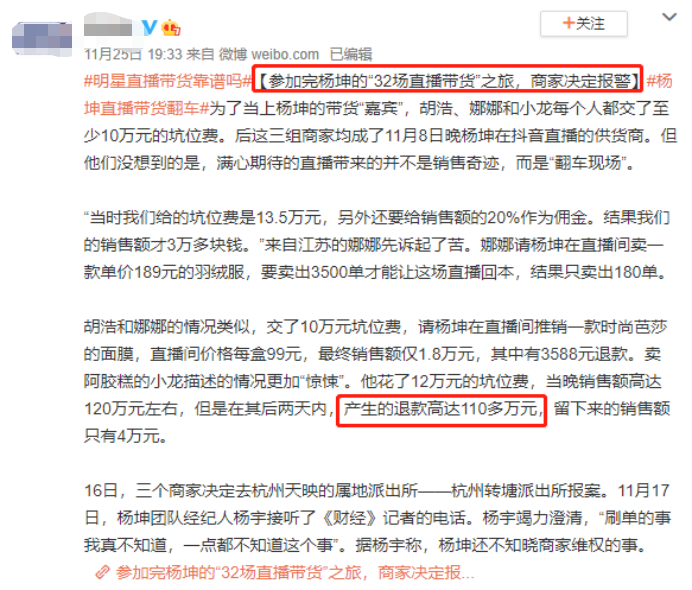 近期在杨坤身上引发的争议不少,而且大多是由直播引起的。就在今年11月,还有商家在参加完杨坤的"32场直播带货"之旅后选择报警。当时这些商家为成为杨坤直播带货的供应商交了高额坑位费,直播结束后却遭遇大量退单,实际销售金额远低于预期,纷纷要求杨坤团队退款。