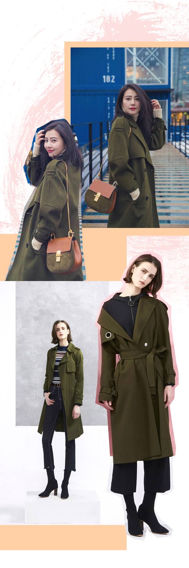 风衣是早秋衣橱必备啊!圆圆女神一袭长款军绿色风衣,潇洒却不失女人味,举手投足间带来出人意料的时髦效果!