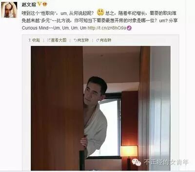 赵文瑄被疑出柜当然也是有一定道理的,已经年过半百的赵文瑄到现在为止还没有找对象这本身在常人看来就不是一件正常的事情,再加上这条微博们内容的发布,更加增添了大家的误会,认为这条挺同性恋的微博其实也在宣判自己的性取向。不过赵文瑄可不是轻易妥协的人,随后赵文瑄继续照常发微博,并且涉及到性取向的问题还和网友开起了玩笑,真的出柜的话也不是一件多丢人的事吧。这都什么年代了,关于真爱谁的理解都不一样,开明的现代人还能不接受这个?