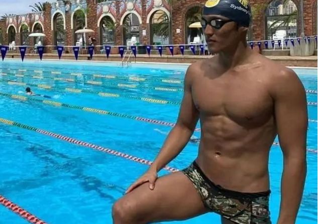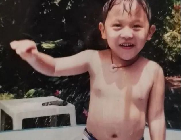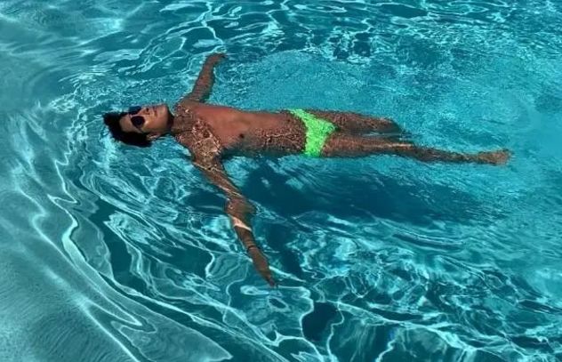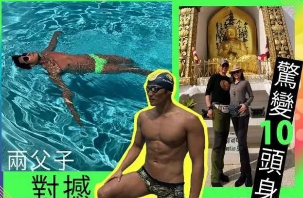 见得他在泳池内穿着荧光色泳裤,仰望天空十分享受。一身腱子肉更是让人十分羡慕,和相差30岁的儿子不相伯仲。