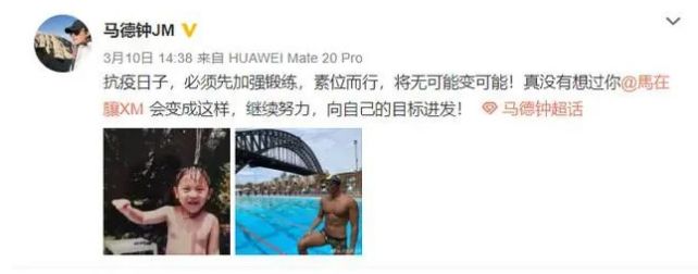 其实在妻子张莜兰发布动态没有多久的时间,马德钟就随即转发,更是在不久前更新社交网,贴出儿子小时候和现今22岁的对比照,感叹道“抗疫日子,必须先加强锻炼,素位而行,将无可能变可能!真没有想过你马在骧会变成这样,继续努力,向自己的目标进发!”