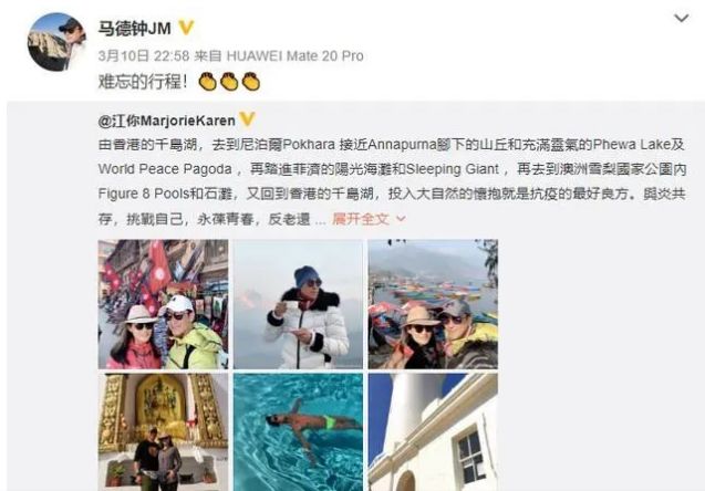 据香港娱乐媒体最新报道,TVB“视帝”马德钟的妻子张莜兰在社交网上,贴出多张和老公早前周游列国的相片。并留言说:投入大自然的怀抱就是抗疫的最好良方。与炎共存,挑战自己,永保青春,返老还童!