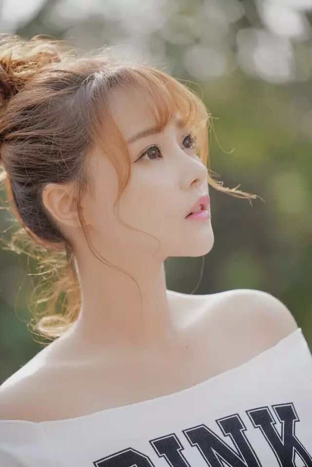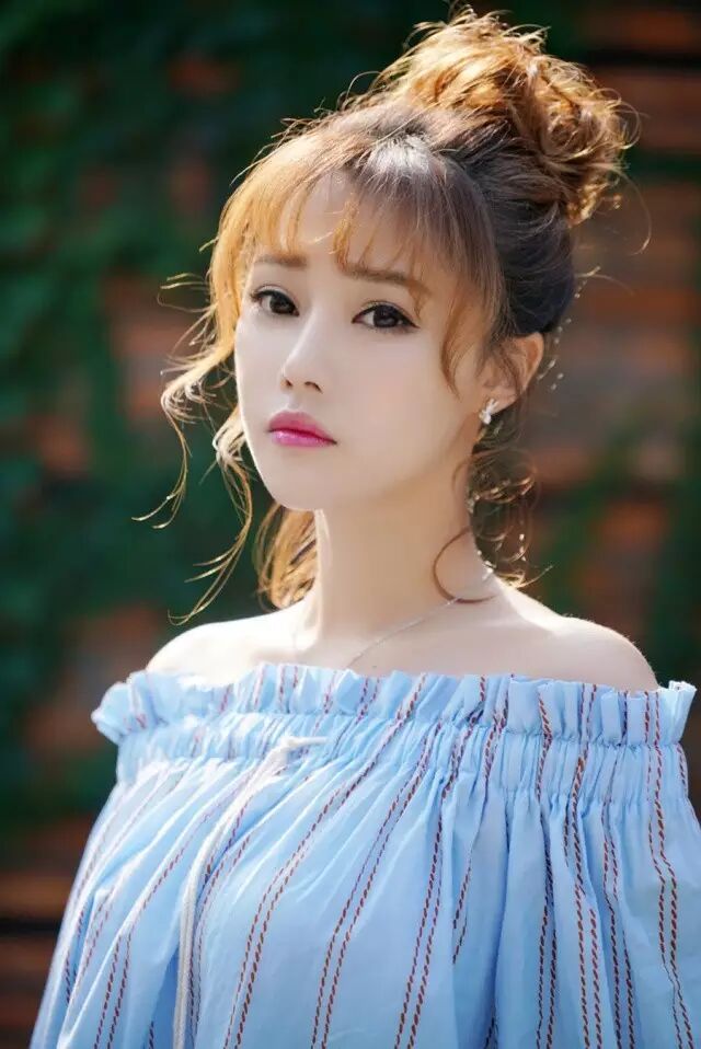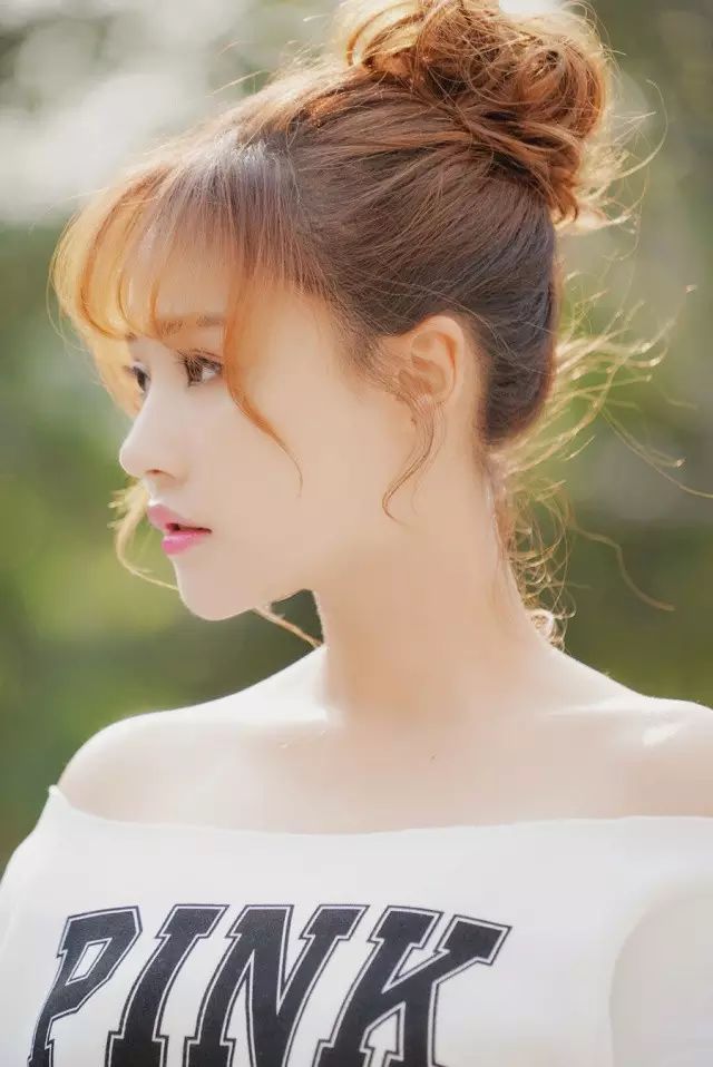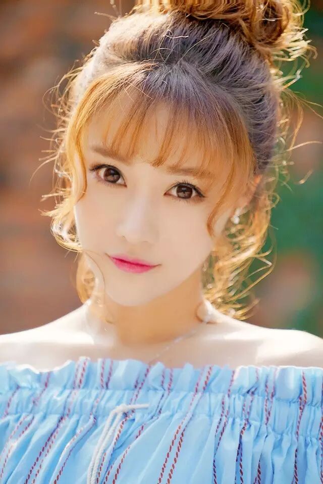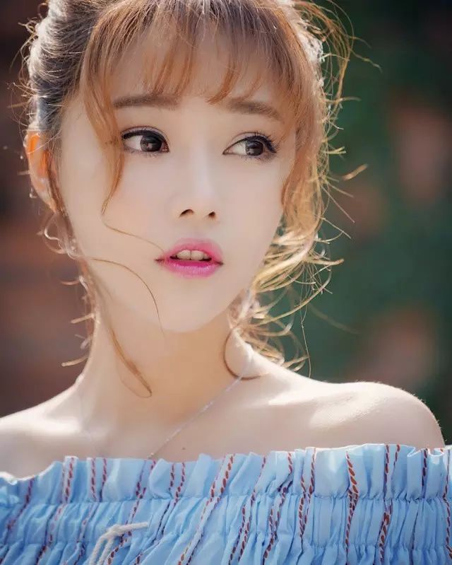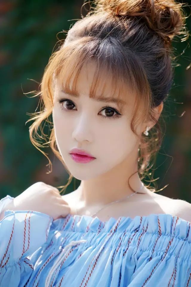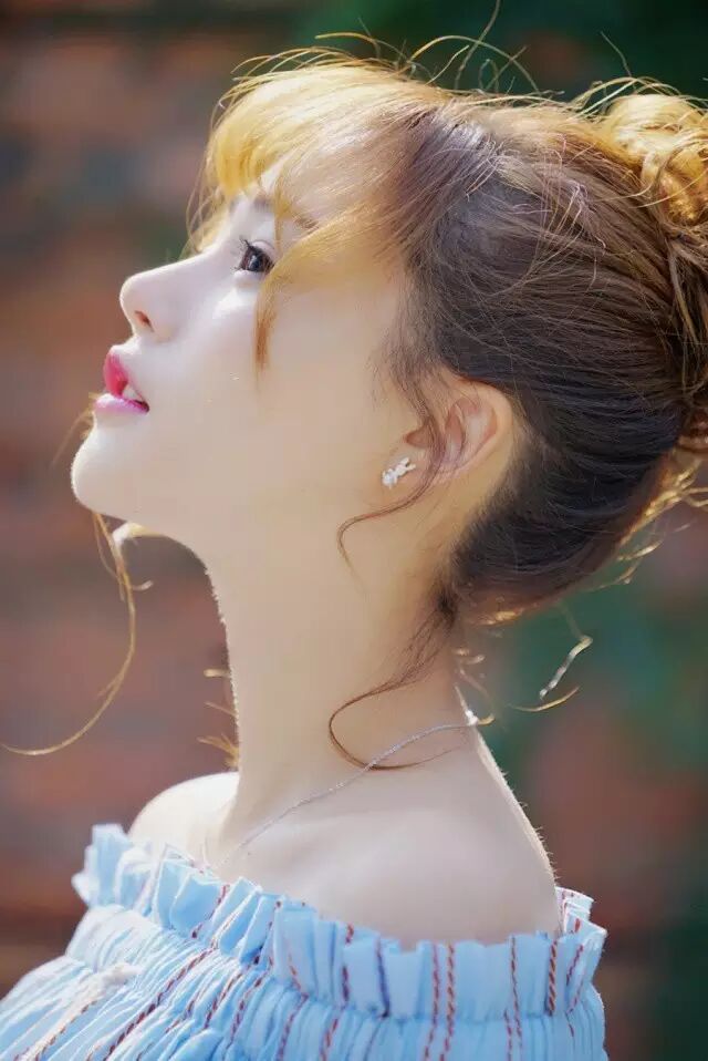 天蓝色一字衫配俏皮丸子头,时而仰望时而凝视,莞尔浅笑的样子清新袭人,清澈的眼神尽显甜美。