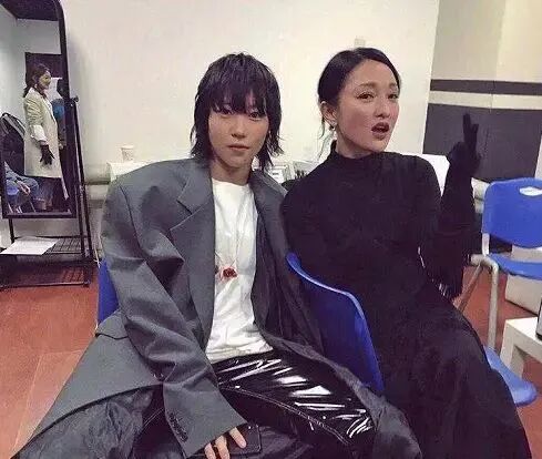 这张照片是窦靖童和周迅两个人的合照,可以发现两个人身上穿的衣服都是比较有明显不一样的风格特色,窦靖童下面穿的是一条黑色的皮裤,在灯光的照射下都会显得闪闪发亮的。