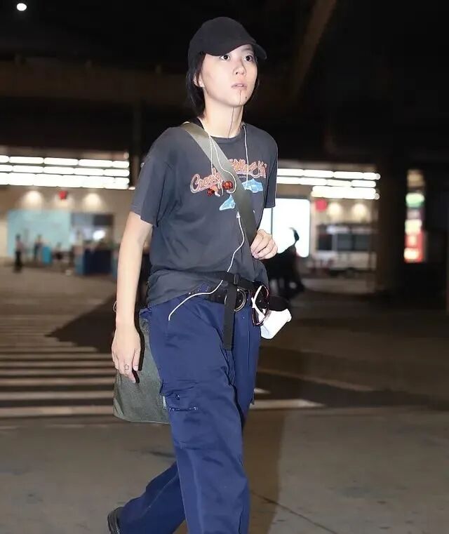 窦靖童的头上戴着一顶黑色的帽子,感觉整个人的打扮显得都会比较偏向于男性的风格,上半身穿的是一件短袖,不过这件短袖的版型看起来比较的宽松,所以显得还是有点松松垮垮。下面搭配的就是一条蓝色的裤子,不过还有一根腰带修饰。