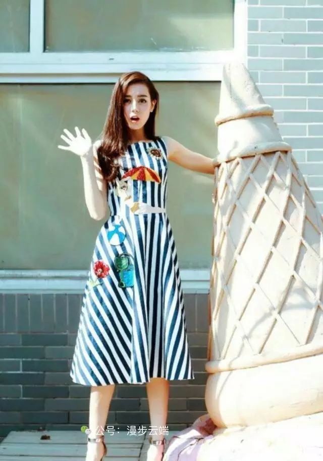 蓝色的无袖连衣裙,条纹款很显瘦,迪丽热巴气质高的没话说了