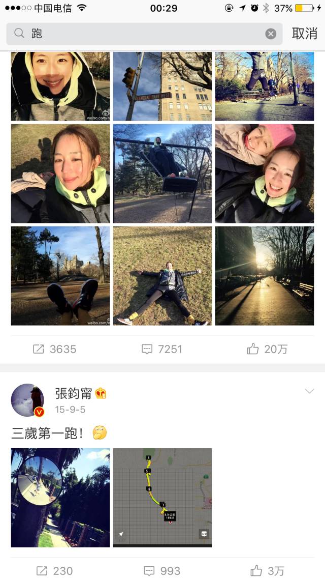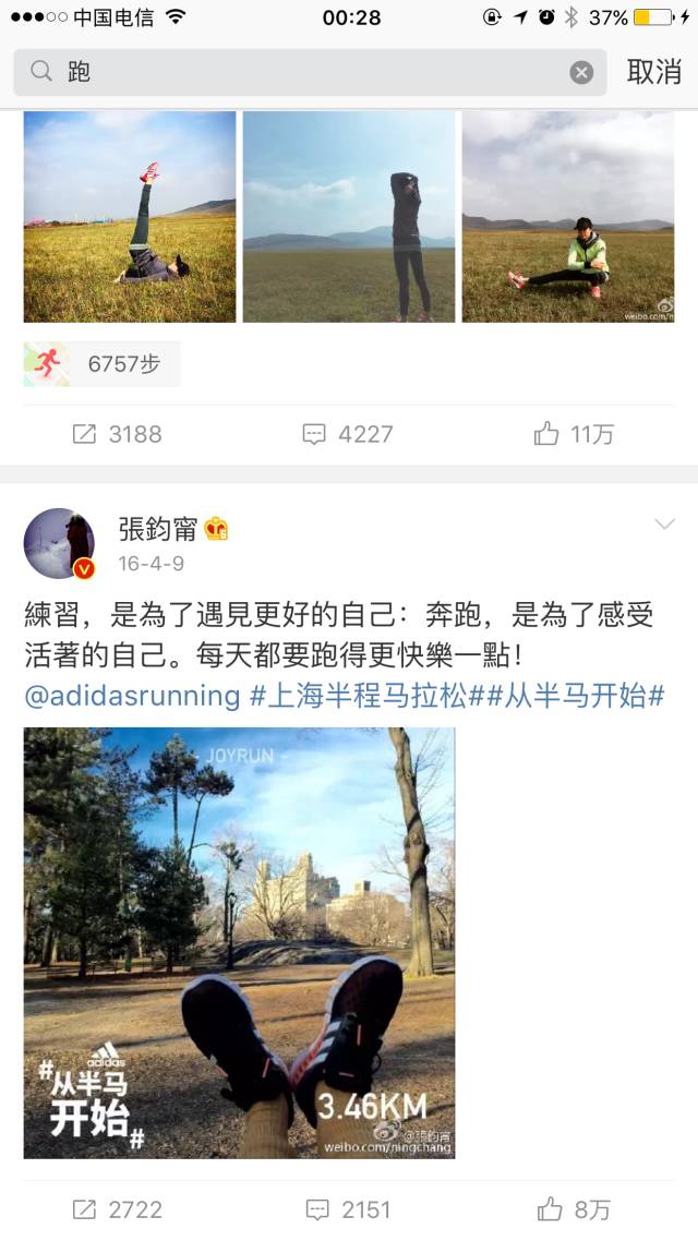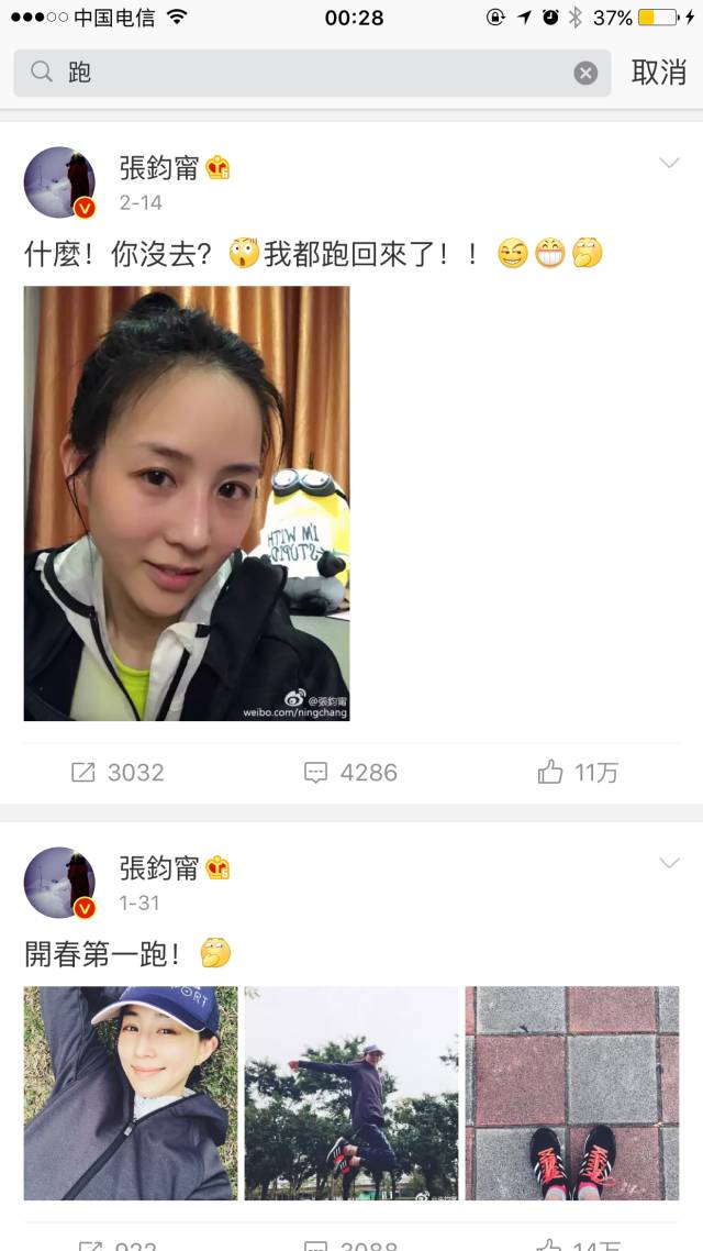 时间是最好的答案,在张钧甯的微博搜“跑”这个关键词,有62条记录,基本都是她的跑步打卡。张钧甯是真的通过那一次的工作挑战爱上了跑步。
