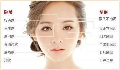 面部皱纹:额头纹、眉间纹、鱼尾纹、泪沟、鼻唇沟、木偶纹等。