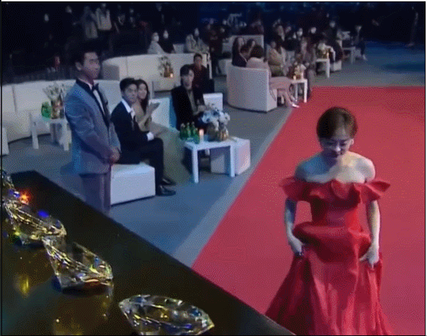 姿势和角度非常重要,孙俪的背之所以看起来那么壮,这个「恰到好处」的抓拍贡献不小。画面上,孙俪正准备走上台,所以低着头,并且双手把裙摆提起来。