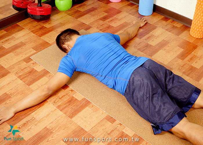 1、起始姿势俯卧,可以趴在床上,双手先向两边伸展。