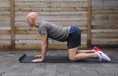 1、双手撑地,膝盖触底,身体保持平直,核心收紧,此时背部保持一定的弯曲。