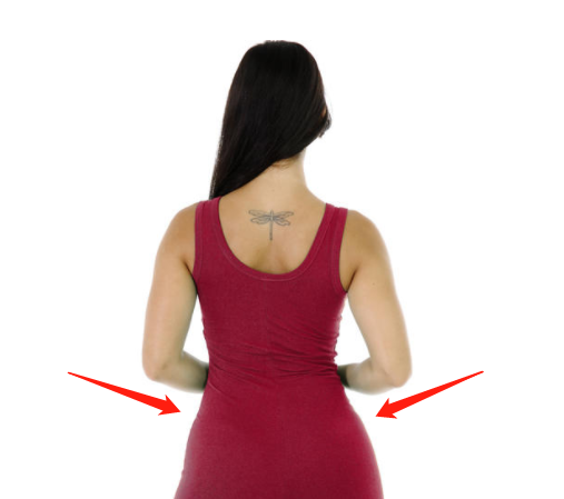 在做这个动作的时候,正常情况下人的背部和肩胛骨就是会自然收紧的。姐妹们可以自己感受一下,把双手放在大腿根外侧的位置,然后两边手肘完全朝向身后,背部立马有挤压感了。