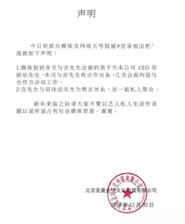 有媒体拍到言承旭与男星田家达在酒店同住了5天,为了躲避狗仔队,他们完全没有一起出过门,点外卖也是分开一份份地买。不过很快工作室就回应了,言承旭住的是独栋大楼而不是酒店,田家达也只是与言承旭是室友关系而已。