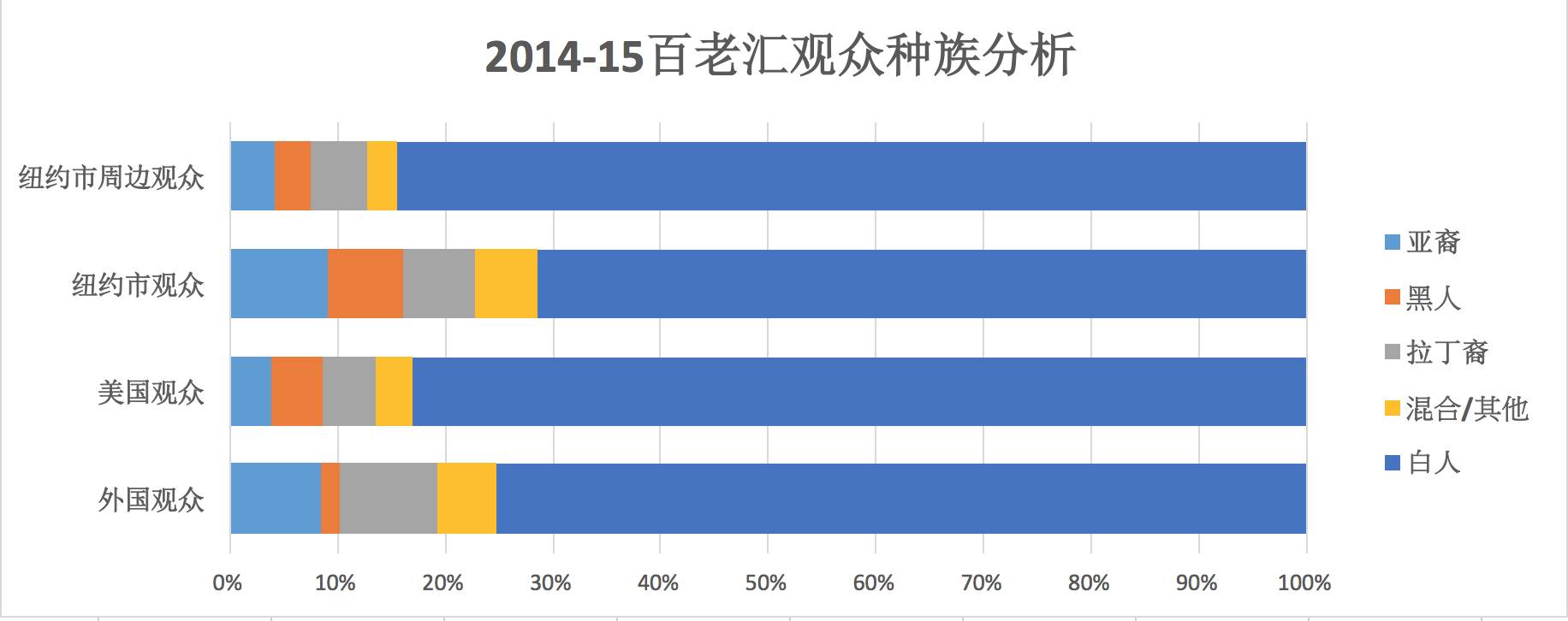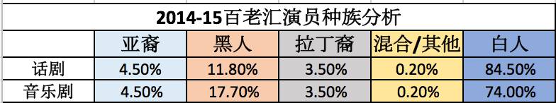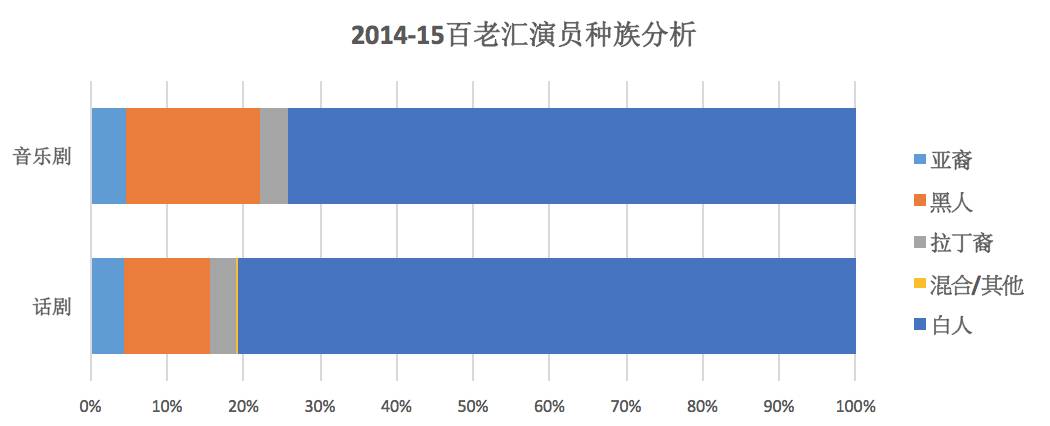 无论是百老汇音乐剧还是话剧,到处都是美国白人演员,很少能见到少数族裔的身影,亚裔演员就更没有多少了。因此百老汇也被称作为“白”老汇。最近十几年百老汇的白色身影越来越少,每个音乐剧、话剧都会至少有1-2个少数族裔演员饰演配角,但是基本上也都是黑人演员为主,亚裔演员可能也只是在做群舞或者是不说话的角色。当亚裔演员做主角的时候,也大多都在《西贡小姐Miss Saigon》、《国王与我The King and I》、《南太平洋South Pacific》这些带有严重东方主义的音乐剧。