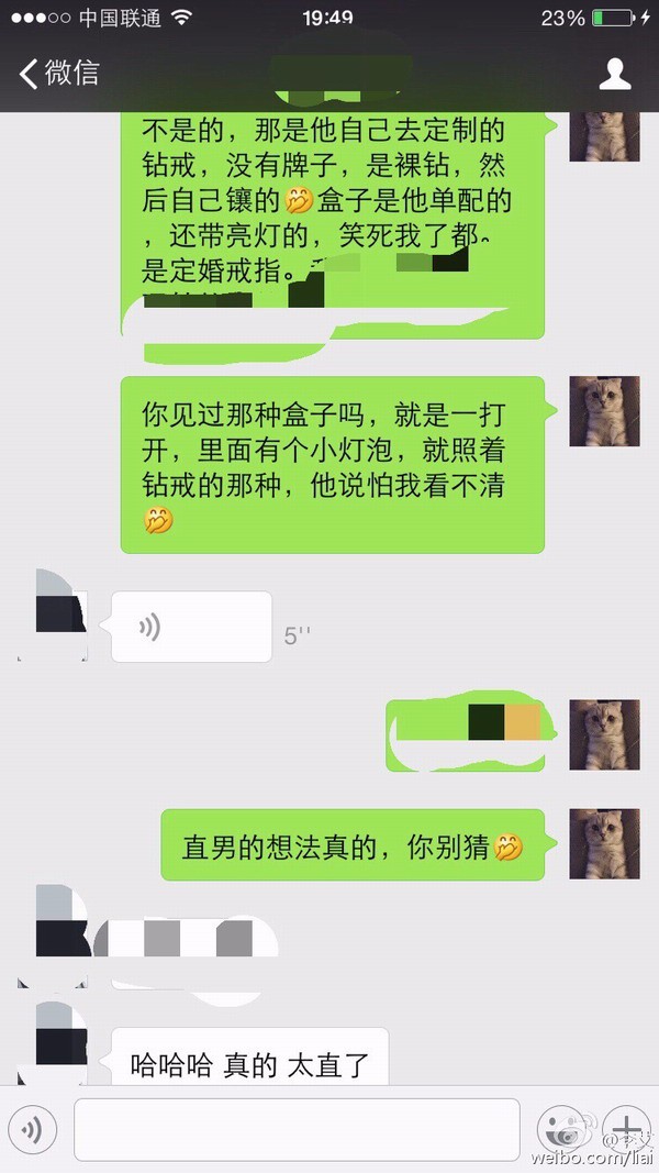 一打开盒子,小灯泡照得戒指闪闪发亮,李艾也着实看醉了,李艾说:“直男的想法真的,你别猜。(偷笑)”