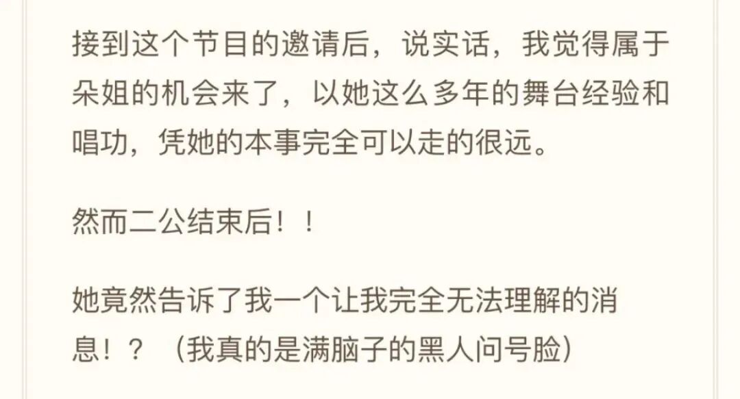 就连她的经纪人,也都有点愤愤不平,“接到这个节目的邀请后,说实话,我觉得属于朵姐的机会来了,以她这么多年的舞台经验和唱功,凭她的本事完全可以走得更远。”