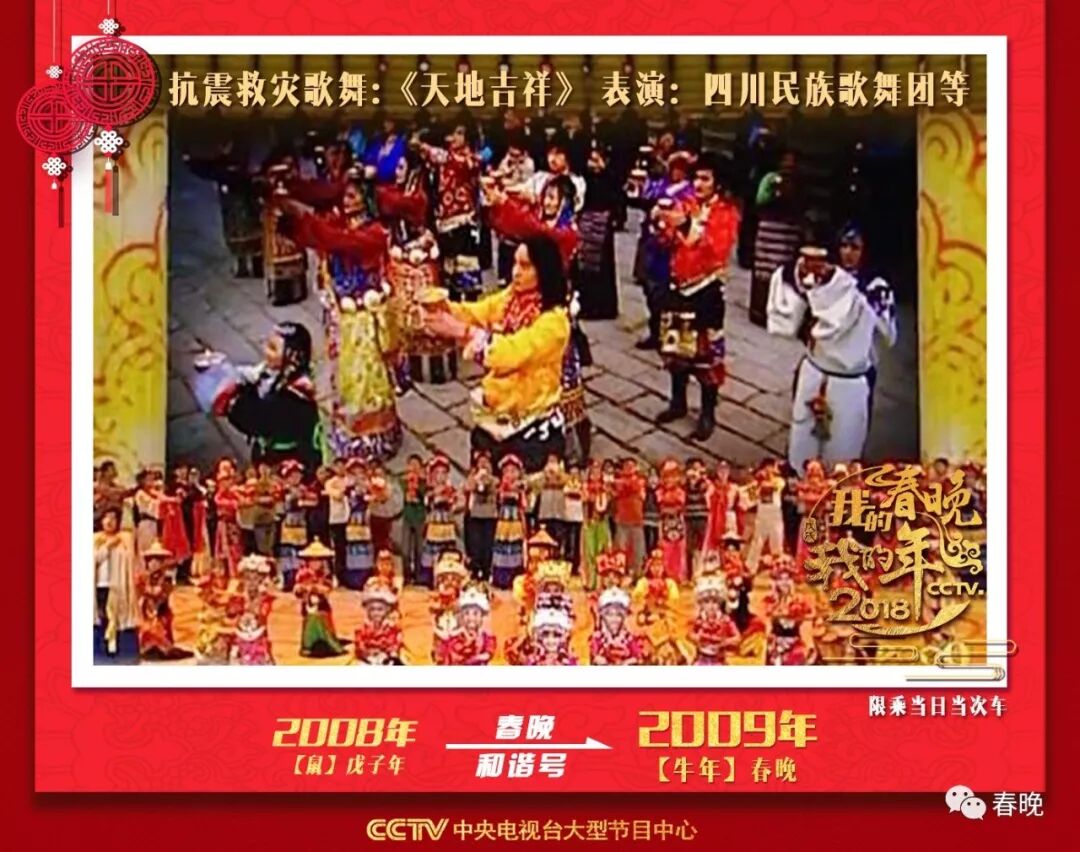 2009年春节也是汶川地震之后的第一个春节,春晚不仅在现场采访了汶川地震英雄代表,还准备了一段灾区采访的视频:这些经历过苦痛的人们,住在活动板房,却洋溢着幸福的微笑,兴奋不已地跟大家拜年问好。而一直坚持为灾区人民表演的四川民族歌舞团也在春晚的舞台上为大家带来舞蹈《天地吉祥》,共同祈愿灾难过后,我们一起建造一个更加美好的家园。