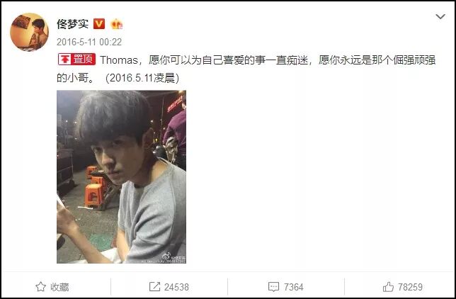 翻看他的微博,置顶微博是2016年5月11日凌晨发过的一条微博:Thomas,愿你可以为自己喜爱的事一直痴迷,愿你永远是那个倔强顽强的小哥。