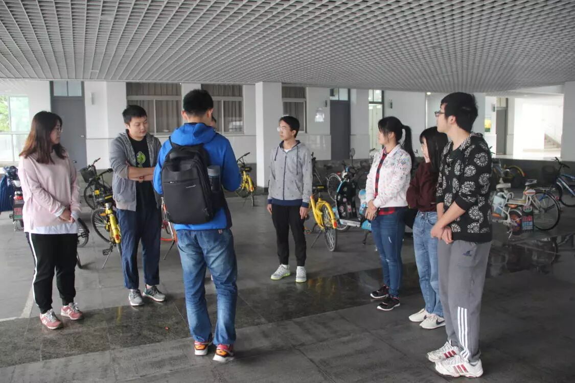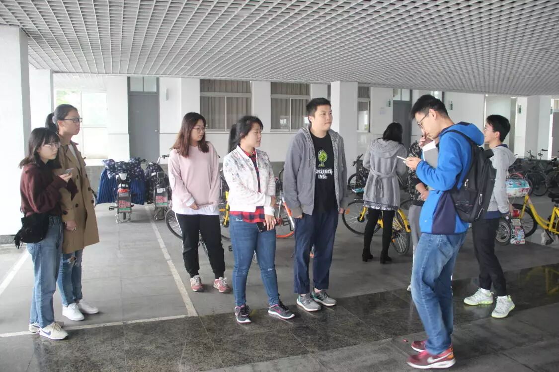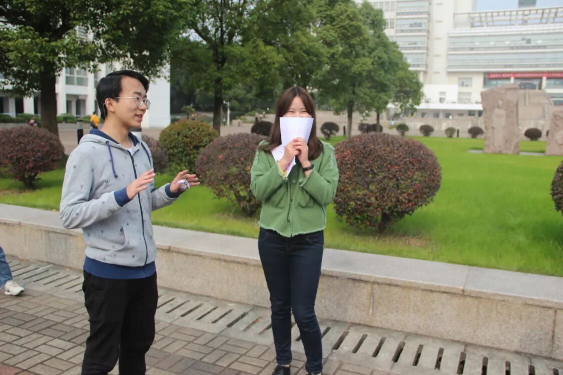 全班同学共分成四组在敬文图书馆前集中,接受第一项考验——动词变位。四组同学打乱顺序围成一个圈,由王思博同学说出本局指定的单词,第一个人从第一人称单数开始变位,然后指定另一个人称给下一个人。全部完成后,四组同学分别前往东区二楼食堂和西区体育中心平台进行接下来的考验。