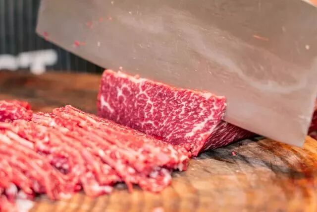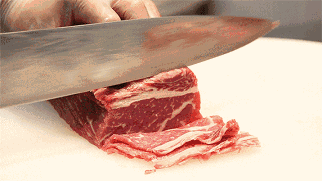 针对不同部门的不同纹路,不一样的切割。但相同的是,每切500g鲜牛肉不超过150秒,这是每位主厨都必须掌握的基本切割标准,务求在每一片牛肉最新鲜的时候给到客人,贼走心呢!
