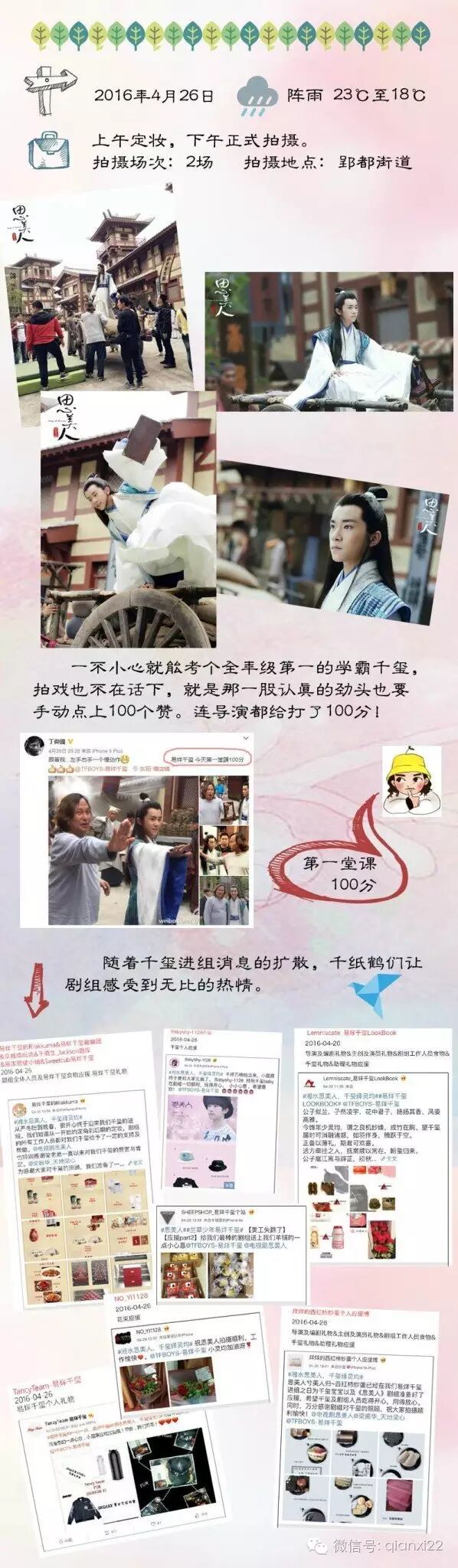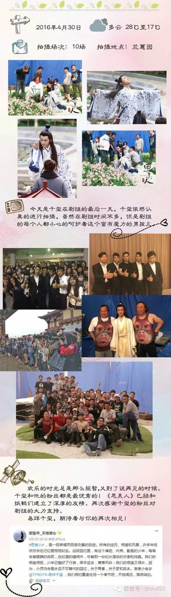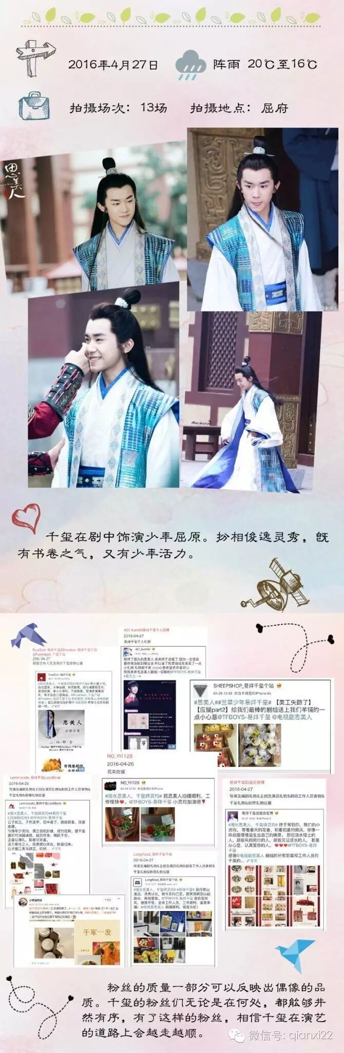 易烊千玺入组暖心日记 TFBOYS易烊千玺 内地男星 2016-05-12 18:17:15 916 创作不易,用心坚持,欢迎请BaGua喝几杯爱心咖啡!打赏并支持本文 打赏并删除本文 以下是千玺在思美人剧组的日记,我家千宝还是那么暖呢!(图片来源于微博)-----------↓扫二维码看更多笑料↓---------- 创作不易,用心坚持,欢迎请BaGua喝几杯爱心咖啡!打赏并支持本文 打赏并删除本文 感谢您的支持鼓励,我会继续努力的!文章地址:用户邮箱:打赏金额:USDT 请输入数字点击”去打赏“,即可进行打赏支持本文章哦 易烊千玺 About the Author TFBOYS易烊千玺 功能介绍:TFBOYS组合成员易烊千玺,2000年11月28日出生于湖南怀化,新晋偶像组合TFBOYS领舞!新声代-代表人物。 Related Posts 易烊千玺实体店被偶遇 夸赞wuli易真好看 2018-04-27 19:02:14 易烊千玺的证件照,收藏了 2017-12-06 20:01:03 TFBOYS你最喜欢的是什么 2017-12-04 20:15:58 易烊千玺的故事(想的) 2017-05-28 21:20:16 易烊千玺遭薛之谦强掀被子 豪迈睡姿曝光 2017-05-08 21:29:37 发表评论