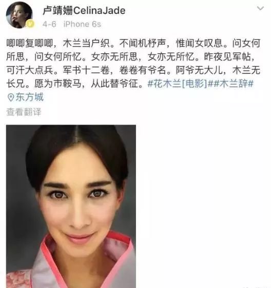 《战狼2》还没打破国内票房纪录之前,女主卢靖姗也在微博分享过自己的古装照片,以及《木兰辞》的片段,同样让人心生猜测。