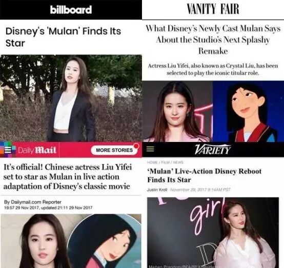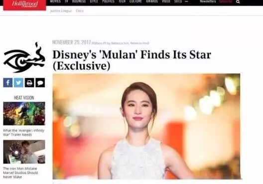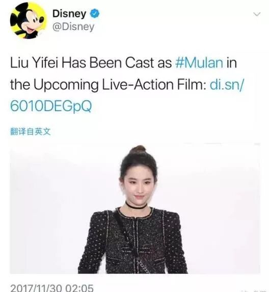 30日凌晨,迪士尼突然宣布《花木兰》英文真人版大电影女主选定中国演员刘亦菲。