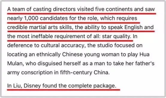 仔细阅读迪士尼的要求,他们为了花木兰这个角色,在过去一年内走遍五大洲进行选角,希望能找到一个英文好又会武术、还要深具明星特质的人选,而刘亦菲是在近千名试镜演员中脱颖而出的。