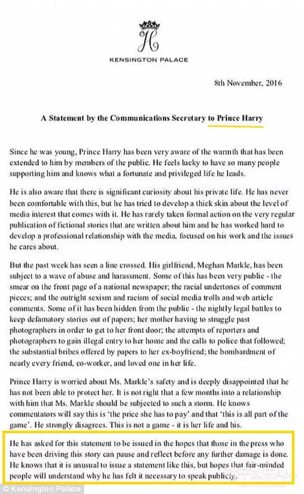 哈里王子为了女友免受外界的非议和干扰,以王子身份发表皇室公开声明,实力宠女友,也是非常niubility了