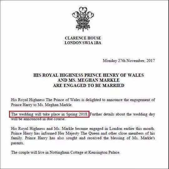 从这份正式声明中可以看出,两人即将在明年春天举行婚礼,婚后小夫妻俩将住在肯辛顿宫的诺丁汉别墅(Nottingham Cottage)里。