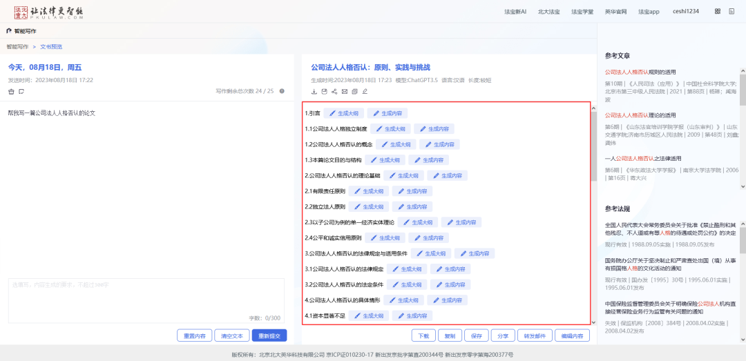 “智能生成文章内容”——GPT模型结合法宝数据库快速生成逻辑自洽、内容丰富的文章。