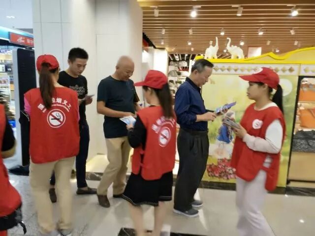 志愿者们发放控烟宣传资料,并向精茂城的工作人员介绍吸烟有害健康的知识。
