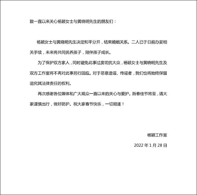 为了保护双方家人,同时避免此事过度叨扰大众,杨颖女士与黄晓明先生及双方工作室将不再对此事另行回应。对于恶意造谣、传谣者,也将始终保留追究其法律责任的权利。