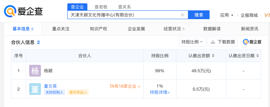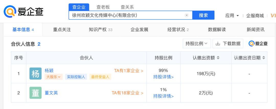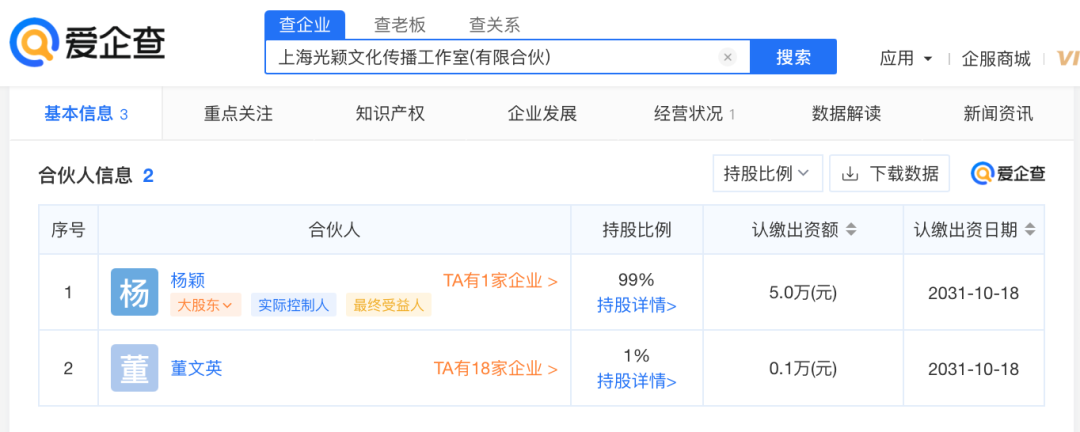 杨颖关联企业共3家,包括徐州欢颖文化传媒中心(有限合伙)、天津天颖文化传播中心(有限合伙)、上海光颖文化传播工作室(有限合伙),杨颖均为股东,持股比例均为99%。