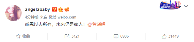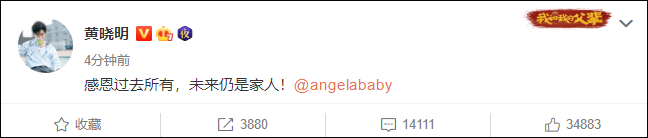 1月28日,黄晓明、angelababy(杨颖)均在微博发文,称“感恩过去所有,未来仍是家人”,并“@”了对方。