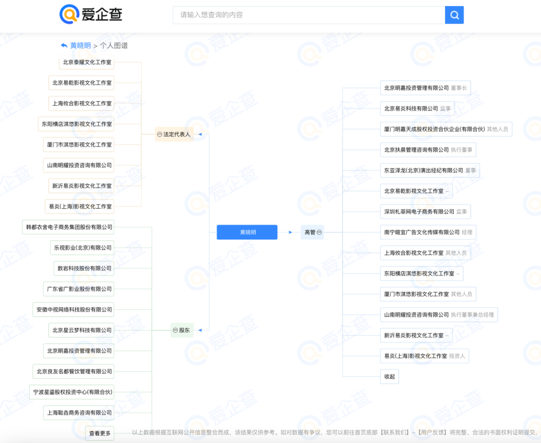 据爱企查App显示,黄晓明名下共有韩都衣舍电子商务集团股份有限公司、乐视影业(北京)有限公司、新沂易炎影视文化工作室等超40家企业。目前在上海攸合影视文化工作室、东阳横店淇悠影视文化工作室等8家企业担任法人代表。