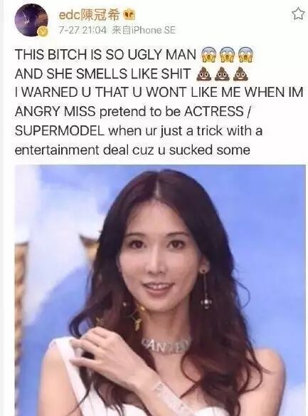 上面这段话大致意思为:这个碧池(侮辱女性的言语)实在太丑了,闻起来像一坨屎,我警告你,你绝对不会喜欢我生气的样子。她假装自己是个演员,其实只是在娱乐圈耍了一些雕虫小技而已,因为她……(小编实在说不出口)