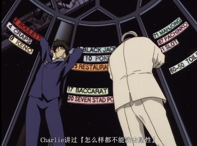 不像史派克带有悲剧宿命论色彩的一生,飞船上的其他人都比他来得释然。杰特有着彪悍的体型,却有着一颗居家的内心。他爱盆景,对爵士乐津津乐道。他还爱下厨,没有肉的“特质青椒肉丝”是他的拿手菜。而菲嗜财好物,经历了54年的冷冻睡眠的她根本想不起自己的过往,于是不断地以各种极端的方式获取自己所爱(钱)。当然还有爱德,对自己的身世也从来闭口不谈。但无论如何,和史派克相比,他们在一定程度上都是活在当下的人。
