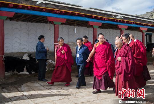 9月27日,全国政协常委、中国佛教协会副会长班禅额尔德尼·确吉杰布大师圆满完成在藏各项走访调研和佛事活动,于9月27日中午乘机离藏返京。图为:班禅额尔德尼·确吉杰布走访调研扎什伦布寺逻玛奶牛养殖场(图片来源:中国新闻网 摄影:何蓬磊)