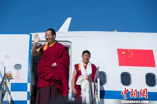 图为全国政协常委、中国佛教协会副会长班禅额尔德尼·确吉杰布大师向送行人群挥手致意(图片来源:中国新闻网 摄影:何蓬磊)