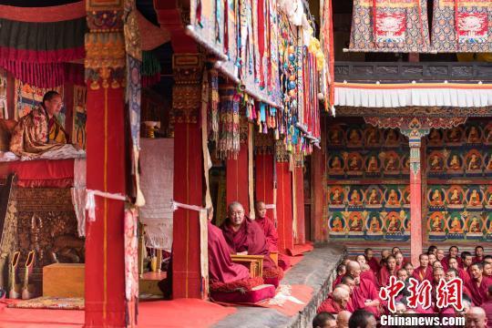 全国政协常委、中国佛教协会副会长班禅额尔德尼·确吉杰布观摩扎什伦布寺僧人《中观学》《般若学》等显宗教法体系立宗答辩会(图片来源:中国新闻网 摄影:何蓬磊)