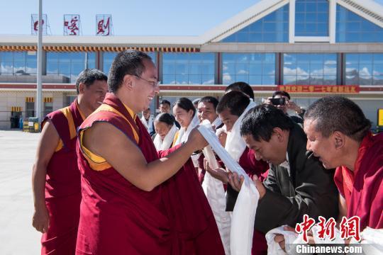 图为送行人群在机场向全国政协常委、中国佛教协会副会长班禅额尔德尼·确吉杰布大师敬献哈达(图片来源:中国新闻网 摄影:何蓬磊)