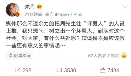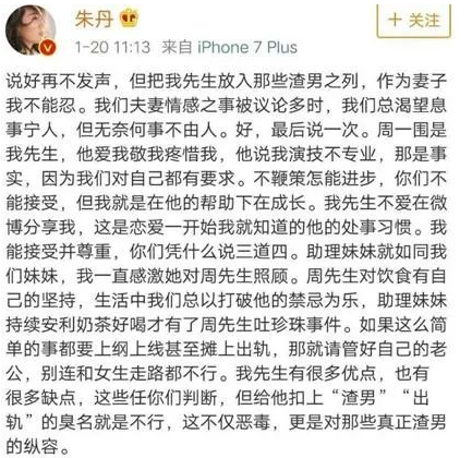 周一围不避嫌和女助理共喝一杯奶茶,被全网骂的时候,朱丹第一个发长文替夫说话。