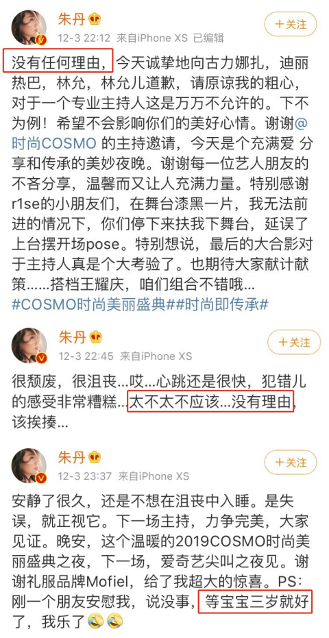 当晚,朱丹连发三条微博表示道歉,措辞也从“太不应该、没有理由”到自我安慰“一孕傻三年”。