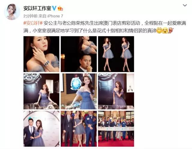 2月4日,安以轩工作室在微博晒出一组安以轩和老公出席某活动的照片,两人十指相扣,还穿了情侣装。