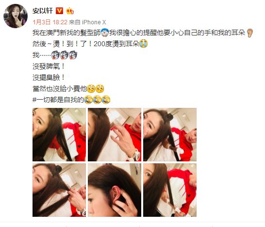 婚后,安以轩经常在社交网站上发布自己和老公的日常生活。前不久,安以轩还在微博上秀恩爱,称老公给自己烫头发,给网友撒了一把狗粮。