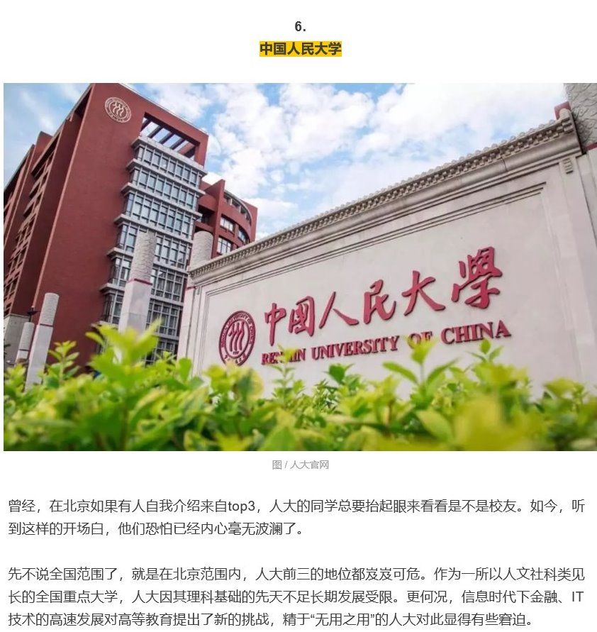 就历史地位言之,最早是京师大学堂和南京高师,后来是五大师范,民国后期是四大名校:中央大学、西南联大、武汉大学、浙江大学。中华人民共和国成立之后,人大地位最为超然,在五六十年代,人大是整个中国人文社会科学高等教育的“母机”和近代教育向社会主义教育转变的“转换器”,人北清师,是当时中国四大名校,人大、北大、清华、哈工大、农大、医大是首批教育部重点支持的六所高校。文革期间,人大不幸被关停。改革开放以后,人大复校,人大牢记毛主席“因为有陕公,中国不会亡”,刘少奇“人民大学主要办其他大学不能办的专业”、邓小平“人民大学是要办的,主要培养财贸、经管干部和马列主义理论工作者”的指示和于光远等人的建议,大力发展人文社会科学。而在当时的中国理工科和社会科学是最吃香的,在这一点上清华大学和人民大学得风气之先。请看人民大学的这份成绩单:据不完全统计,人民大学的十八大中央两委委员最多(27人,第二清华有26人),人民大学的上市公司高管最多(816人,第二浙大有662人),人民大学的十九大中央两委委员有35人,北大为37人,而清华仅有22人。在埃瑞森大学中国校友会排行榜中,北大、清华、人大荣膺中国八星级大学,在广州日报大学一流学科排行榜中人民大学12个学科全国第一,高于清华大学的11个学科和北京大学的8个学科,在新出炉的长江学者建议名单中人民大学人文社会科学领域入选学者最多,在新出炉的全国高校智库排名中人民大学中国发展与战略研究院力克北大、清华排名全国第一,在新出炉的经党中央批准的习近平新时代中国特色社会主义思想研究院中,北大、清华、人大是唯一入选的三所高校。在“中国共产党与世界政党高层对话”收尾会、金砖国家老年峰会、人文奥运研究中心、巴拿马总统博士学位授予仪式等站位上,人民大学不弱于清华、北大,远远拉开和华五、C9的差距。从雷阳事件、武继红事件、于欢事件、质问司马南事件、蓄发明志事件,到刘强东、张磊、邹刚、耿建明、叶澄海等为母校捐资,再到人大新闻学院《新闻周报》仗义执言等,人大学子的校友凝聚力和社会责任感可以说高居全国高校前列,以至于英国《金融时报》把“人大校友”作为一个专有名词!
